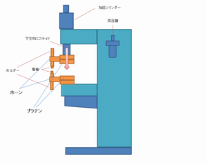 電極で加圧を行い、加圧した電極より金属母材へ大電流を流すことにより、電気抵抗によるジュール熱を発生させ、